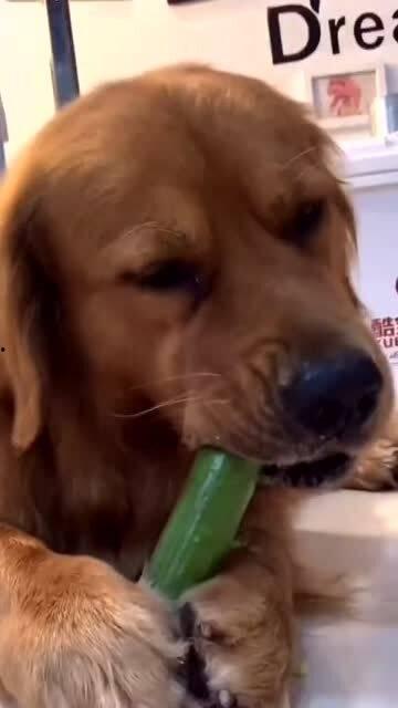 当小狗咬下蜜瓜的那一刻,它的眼神会变得非常专注。仿佛在说:“这个味道真不错,我要好好享受一下。”